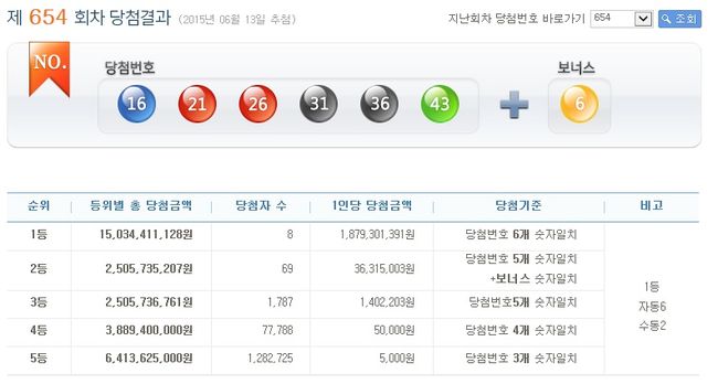 15일 나눔로도 추첨결과 제654회 로또 1등 당첨번호는 16, 21, 26, 31, 36, 43 이다. 2등 보너스번호는 6번이다.