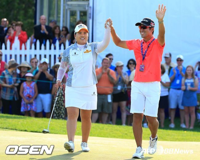 박인비가 KPMG 위민스 PGA 챔피언십에서 우승을 결정 짓자 남편 남기협 코치가 축하의 포옹을 하고 있다. 그 옆에서 김세영과 백규정이 축하 물세례를 뿌리고 있다. 아래 사진은 남편 남기협 코치가 박인비의 손을 번쩍 들어 올리고 있는 모습. /ⓒAFPBBNews = News1(무단전재 및 재배포 금지)