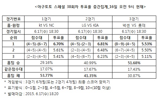 [야구토토] 국민체육진흥공단(www.kspo.or.kr)이 발행하는 체육진흥투표권 공식 온라인 발매 사이트 베트맨(www.betman.co.kr)이 오는 17일에 열리는 2015시즌 한국프로야구(KBO) 3경기를 대상으로 한 야구토토 스페셜 38회차 투표율을 중간 집계한 결과, 참가자의 51.68%는 넥센-롯데(3경기)전에서 넥센이 롯데에 승리할 것이라 예상했다.