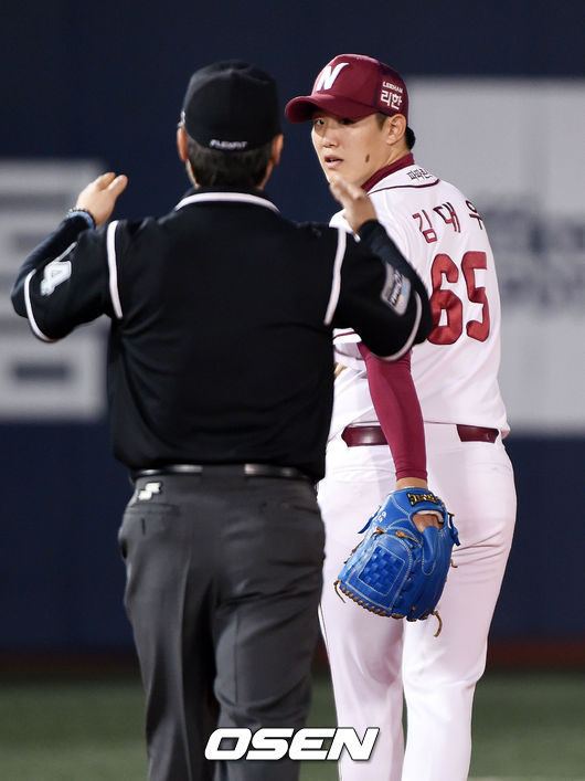 넥센 히어로즈 언더핸드 김대우가 투수교체로 마운드에 올랐지만 공 한 개도 던지지 못하고 다시 불펜으로 돌아가야 했다.