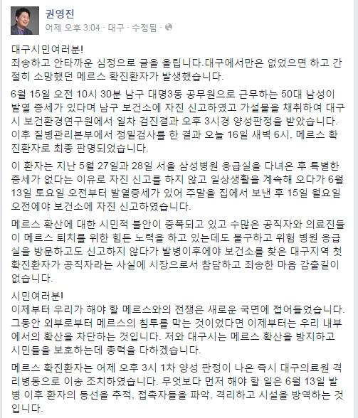 권 시장은 "대구에서만은 없었으면 하고 간절히 소망했던 메르스 확진환자가 발생했다"면서 "메르스 확산에 대한 시민적 불안이 증폭되고 있고 수많은 공직자와 의료진들이 메르스 퇴치를 위한 힘든 노력을 하고 있는 데도 불구하고 위험 병원 응급실을 방문하고도 신고하지 않다가 발병 이후에야 보건소를 찾은 대구지역 첫 확진환자가 공직자라는 사실에 시장으로서 참담하고 죄송한 마음 감출길이 없다"고 썼다.