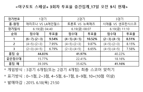 MLB 3경기 대상 야구토토 스페셜+ 3회차 투표율 중간집계