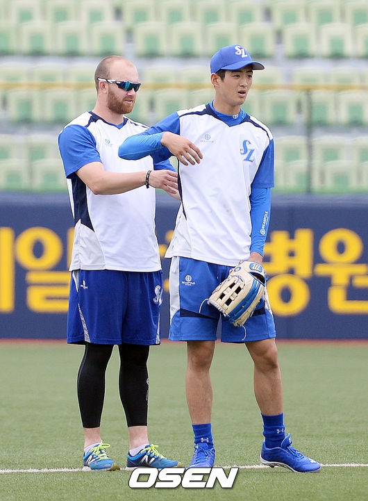 17일 오후 대구구장서 열린 ‘2015 타이어뱅크 KBO 리그’ 삼성 라이온즈와 두산 베어스의 경기에 앞서 삼성 구자욱과 클로이드가 장난을 치고 있다.