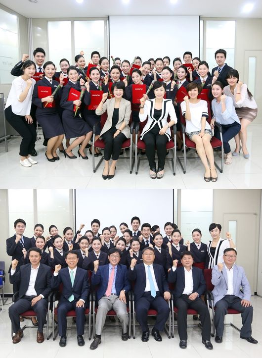 2015년 상반기 객실신입승무원 수료식 후 객실본부 단체사진과 2015년 상반기 객실신입승무원 수료식 후 임직원 단체사진 / 이스타항공 제공