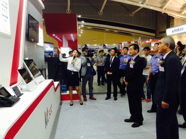 KT SAT의 전시관에서 유정복 인천광역시장 등 VIP 관람객들이 'HD급 실시간 영상전송 솔루션'을 둘러보고 있다. 'HD급 실시간 영상전송 솔루션'은 위성망을 통해 사고 상황을 담은 경비정의 HD급 영상을 실시간으로 구조 본부에 전송해, 해상 사고의 70%에 달하는 연근해상의 사고 예방에 기여할 것으로 기대된다. / KT SAT 제공