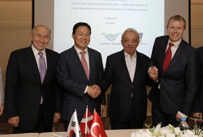17일 오후(현지시각) 터키 이스탄불에서 열린 이스탄불 신공항 운영지원 컨설팅사업 계약 체결식에서 박완수 인천공항공사 사장(왼쪽에서 2번째), 니하트 외즈데미르 MAPA 회장(왼쪽에서 1번째), 메흐메트 센지즈 Cengiz 회장(왼쪽에서 3번째), 미카엘 브룬 시외르슬레우 코펜하겐공항 해외사업 최고책임자(왼쪽에서 4번째)가 기념사진을 촬영하고 있다. / 인천공항공사 제공