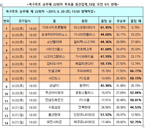 국민체육진흥공단(www.kspo.or.kr)이 발행하는 체육진흥투표권 수탁사업자인 스포츠토토(www.sportstoto.co.kr)는 오는 20일(토)부터 21일(일)까지 벌어지는 국내프로축구 K리그 클래식 6경기 및 일본프로축구 J리그 8경기 등 총 14경기를 대상으로 한 축구토토 승무패 22회차 투표율 중간집계 결과, K리그 클래식 수원-전북(12경기)전에서 국내 축구팬 44.53%가 전북의 승리를 점쳤다고 밝혔다.