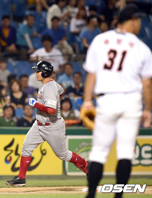 6회초 2사 1,3루 SK 이재원이 스리런 홈런을 때린 뒤 베이스를 돌고 있다.