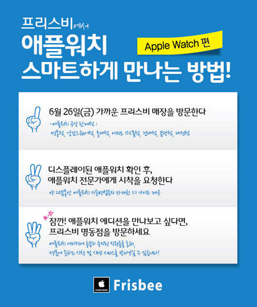 국내 최대 애플 전문 매장 프리스비(Frisbee)가 애플워치 공식 판매점으로써 시착 가이드를 공지했다.