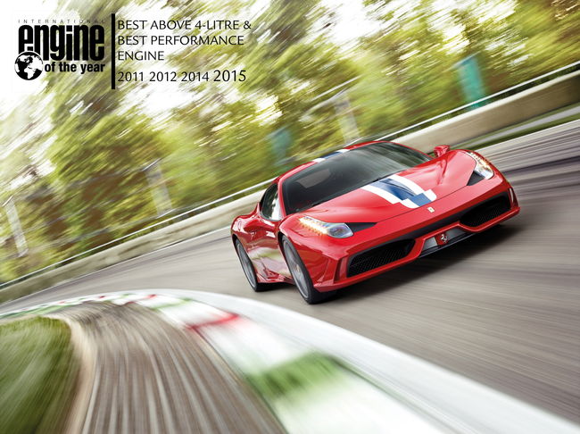 페라리의 자연흡기 4.5리터 V8 엔진은 ‘최고 성능 엔진(Best Performance Engine of the Year)’과 ‘4리터 이상 엔진(Above 4-liter Engine)’ 2개 부문의 타이틀을 따냈다. 이는 458 이탈리아, 458 스파이더, 그리고 458 스페치알레와 458 스페치알레 A에 장착되는 엔진이다.