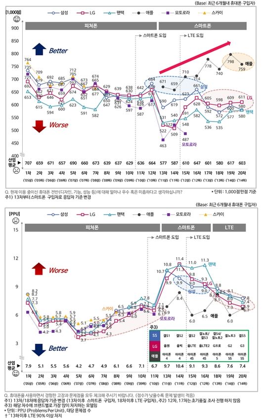 초기품질 문제점 수는 휴대폰 구입 6개월 이내인 소비자들이 구입 이후 체험한 결함-하자-고장 등을 호소한 수다. 당연히 숫자가 클수록 좋지 않다. 휴대폰 시장 전체로 보면 스마트폰으로 넘어 가기 전 평균 6~7건이었던 피쳐폰의 문제점 수가 10건 수준으로 크게 증가했다. 평균 10건 수준이던 문제점 수는 다시 점차 줄어 현재는 7건대로 과거 피쳐폰 수준에 근접하고 있다.