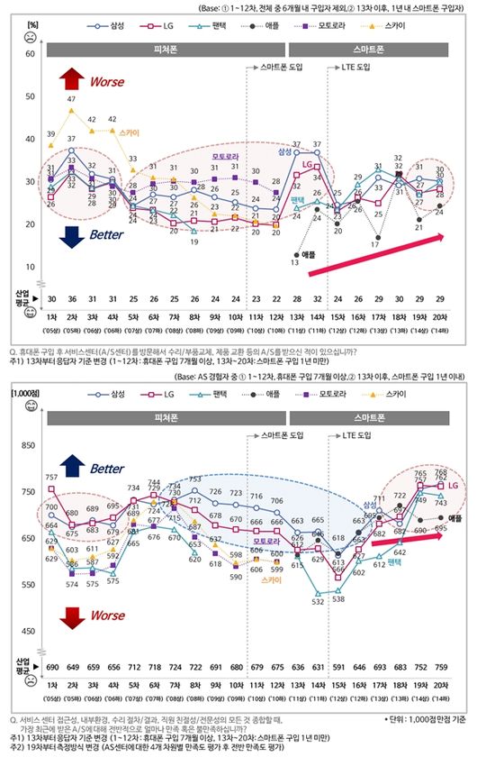 휴대폰을 구입한지 1년 이내인 소비자들이 휴대폰의 결함-하자-고장 등의 문제점 때문에 A/S를 받은 적이 있는지 물었다. 과거 피쳐폰 시절 지금은 사라진 스카이와 모토로라의 A/S 경험률이 높았으며, 이들을 제외하고는 삼성이 가장 높았다. LG와 비교한다면 피쳐폰 시절부터 스마트폰 시대가 열린 이후에도 대부분의 조사에서 삼성 소비자가 A/S 받은 비율이 LG보다 높았다.