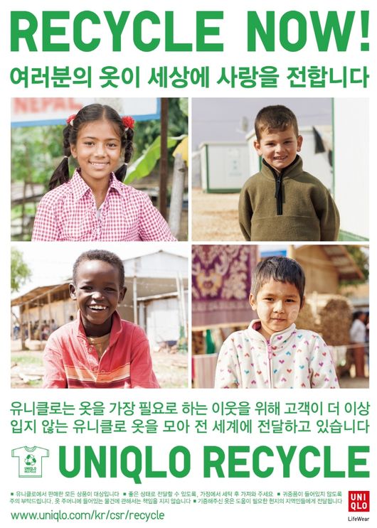 유니클로는 지난 2007년부터 전 세계 소비자들로부터 기부 받은 유니클로 의류를 유엔난민기구(UNHCR)를 통해 난민 캠프로 전달하는 '전 상품 리사이클 캠페인'을 진행하고 있다. 국내에서는 2011년부터 캠페인을 시작했으며, 현재까지 소비자들의 기부와 회사의 지원으로 총 14만 벌의 의류를 수거하고 작년 한 해에만 5만5천 벌을 기부받는 등 소비자들의 참여율이 지속적으로 높아지고 있다.