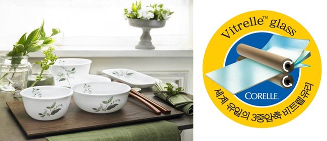 월드키친의 디너웨어 브랜드 코렐(Corelle)에서 사용하는 비트렐 (Vitrelle) 유리는 3장의 유리 레이어가 압축된 특수 소재로, 여타의 구멍이나 갈라짐이 없이 촘촘하고 매끈하게 제작된 고밀도 특수 유리 재질이다. 이와 같은 소재의 특성상 음식을 담고 설거지를 하는 과정에서 음식물 찌꺼기와 같은 오염물질들이 그릇 내로 스며들 수 없어 세균 번식으로부터 안심하고 사용할 수 있다.