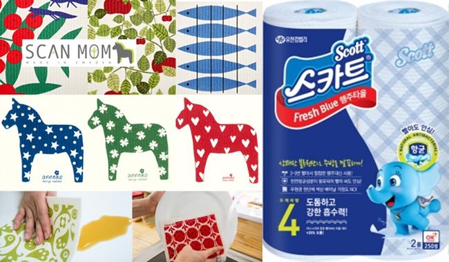 여러 번 빨아쓰는 행주가 꺼림칙하다면, 행주 대용으로 종이타월을 사용하는 것도 좋다. 유한킴벌리의 스카트는 기존의 '항균 빨아쓰는 타올'을 업그레이드한 신제품 향균 프레시 블루 행주 타올을 출시했다. 천연 향균 성분이 함유되어 세균 걱정 없이 위생적인 사용이 가능하며, 2번, 3번 빨아 쓸 수 있어 경제적이다. 국내 최초 특허 하이드로니트 공법을 사용한 소재로 물에 강하며, 기존 제품보다 25% 도톰해서 행주와 같은 사용감을 준다. 또한 무형광 원단, 천연 항균 성분을 첨가했기 때문에 식기 등에도 안전하게 사용할 수 있다.