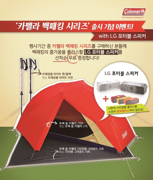 또 콜맨은 백패킹 시리즈 출시 기념으로 '카펠라 백패킹 시리즈'를 구매한 소비자에게 22일부터 백패킹의 즐거움을 더할 LG 포터블 스피커와 전용 범퍼케이스를 증정할 예정이다.(한정 수량 소진 시 조기 종료)