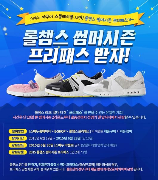 스베누 공식사이트 E샵을 접속해 롤챔스 프리패스 이벤트 제품인 아쿠아슈즈 스플래쉬를 구매하면 자동으로 참여가 되며 2명을 선정해 롤챔스 서머시즌 프리패스 티켓을 증정한다.