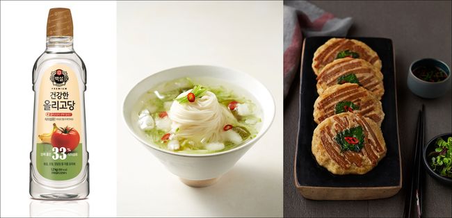 왼쪽부터 백설 건강한올리고당, 수분 보충과 갈증해소에 좋은 오이냉국수, 소화를 도와주는 도토리묵 메밀전 / CJ제일제당 제공
