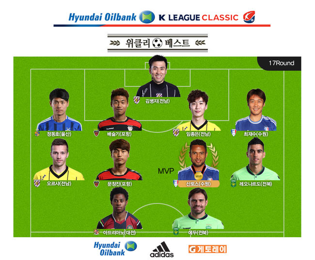 한국프로축구연맹(이하 연맹)은 23일 지난 주말 열린 K리그 클래식 17라운드 MVP와 베스트 11, 베스트 팀, 베스트 매치 등을 선정해 발표했다.