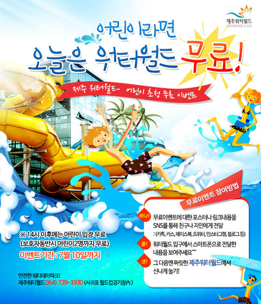 오는 7월 10일까지 진행되는 '어린이 무료 초청 이벤트'는 무료이벤트에 대한 포스터나 링크 내용을 SNS로 공유하고 매표소에서 확인 받으면 입장료(정상가격 소인 2만 8000원) 없이 무료로 워터월드를 이용하는 이벤트이다. 워터테마파크의 특성상 보호자를 동반해야 입장할 수 있고, 어린이 2인까지 무료입장 가능하다.