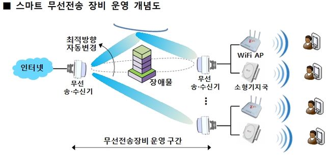 또한, '스마트 무선전송' 장비는 무선 송수신기가 고정된 방향에서 각각 1대1 방식으로만 운영되던 기존 무선전송 장비의 한계를 넘어, 인터넷 망과 연결된 무선 송수신기가 빔 방향 전환을 통해 다수의 무선송수신기와 통신하는 방식으로 네트워크 구축 효율성을 높일 수 있다.