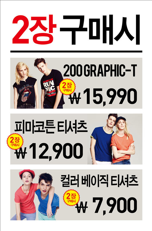 새롭게 출시한 200가지 스타일의 그래픽 티셔츠와 피마코튼 티셔츠, 컬러 베이직 티셔츠를 2장 구매 시 각각 1만 5990원과 1만 2900원, 7900원에 구입 가능하다.