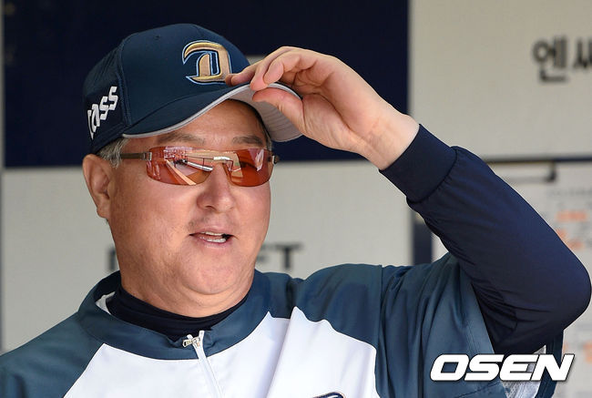 24일 오후 경남 창원 마산야구장에서 열릴 '2015 타이어뱅크 KBO 리그' NC 다이노스와 KIA 타이거즈의 경기에 앞서 NC 김경문 감독이 취재진과 이야기를 나누고 있다.