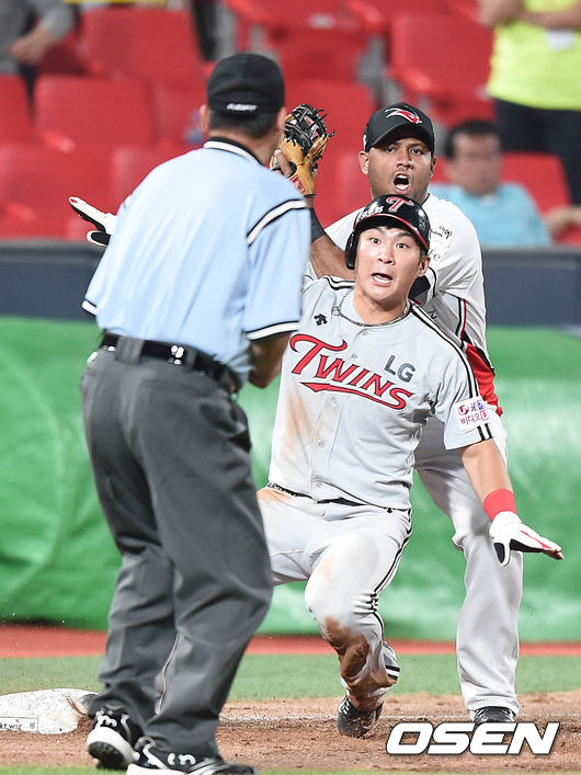 24일 오후 경기 수원 kt위즈파크에서 '2015 타이어뱅크 KBO 리그' kt 위즈와 LG 트윈스의 경기, 5회초 무사 2루 LG 오지환이 양석환의 외야플라이에 3루 진루를 시도하다 아웃당하고 있다.