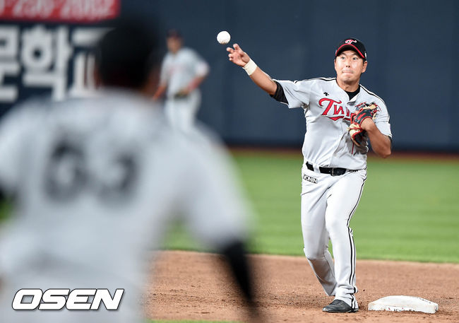 24일 오후 경기 수원 kt위즈파크에서 '2015 타이어뱅크 KBO 리그' kt 위즈와 LG 트윈스의 경기, 5회말 1사 만루 2루수 백창수가 kt 김상현의 타구를 병살처리하고 있다.
