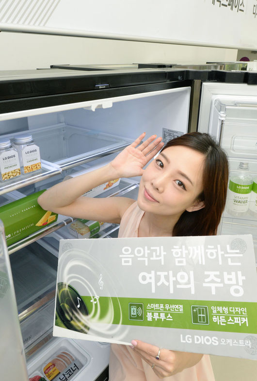 950리터와 870리터 용량의 ‘디오스 오케스트라’는 냉장고 문을 여는 빈도와 냉기손실을 절반으로 줄인 ‘더블 매직스페이스’ 냉장고의 상단에 고품질의 블루투스 스피커를 결합한 제품이다.