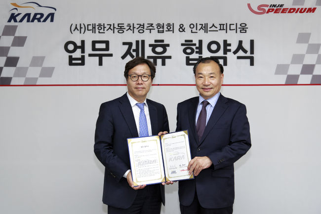 인제스피디움과 (사)대한자동차경주협회(KARA)는 25일 서울 무교동 KARA 사무실에서 업무협약을 체결하고 KARA 회원의 복지 증진과 인제스피디움 회원의 KARA 드라이버 라이선스 취득 편의, 그리고 모터스포츠 저변 확대를 위해 공동 노력하기로 했다.