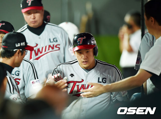 25일 오후 수원KT위즈파크서 열린 '2015 타이어뱅크 KBO 리그' kt 위즈와 LG 트윈스의 경기, 7회초 LG 선두타자 유강남이 중월 솔로 홈런을 날린 후 덕아웃에서 하이파이브를 하고 있다.