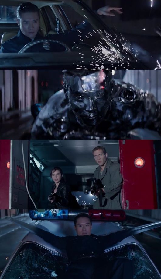 공개된 영상은 사라 코너(에밀리아 클라크 분)와 카일 리스(제이 코트니 분)가 자신들을 쫓아오는 T-1000(이병헌 분)과 맞서 싸우는 장면. 특히 차에서 운전을 하던 T-1000이 액체로 변해 이들을 위협하는 장면은 보는 이들의 긴장감을 높인다.