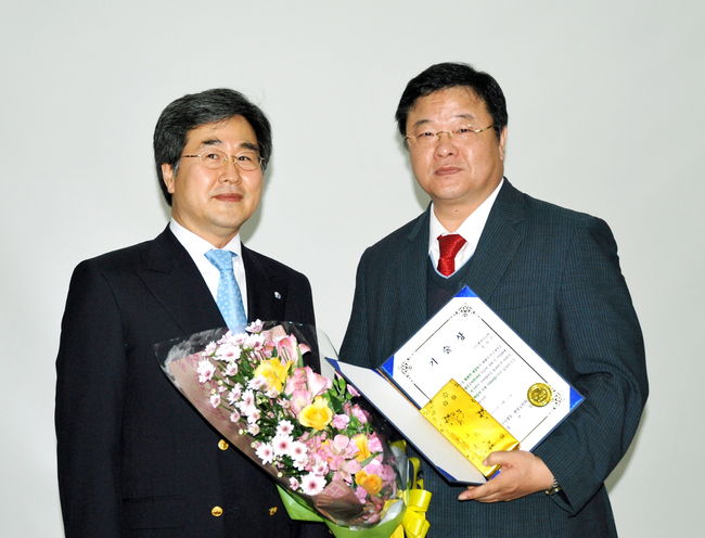 왼쪽은 한국미생물·생명공학회 정건섭 회장, 오른쪽이 정명준 대표 / 쎌바이오텍 제공