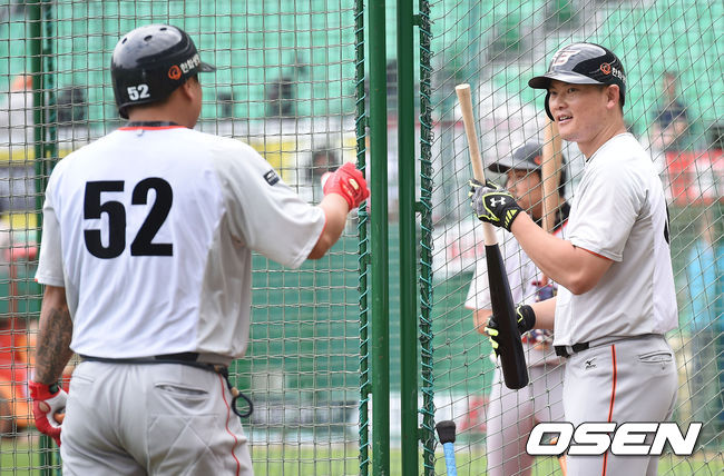 경기전 한화 이성열과 김태균이 김태완의 배트를 유심히 살켜보고 있다.