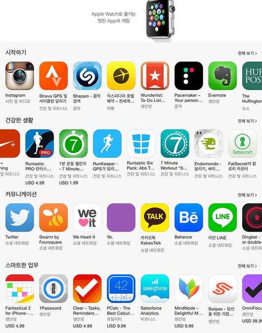 애플이 스마트시계 애플워치의 국내 출시에 맞춰 앱 추천 코너를 마련했다.