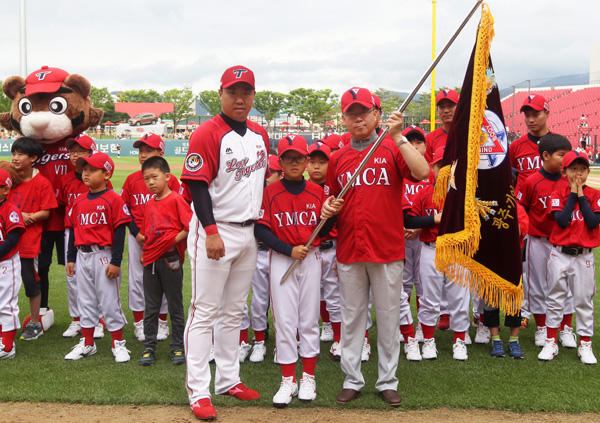 KIA타이거즈 주장 이범호는 백석 단장에게 광주기아 YMCA 리틀야구단 깃발을 전달하며, KIA 선수단은 특별 제작한 ‘러브투게더 유니폼’을 입고 경기에 출전해 리틀야구단 어린이들을 응원한다.