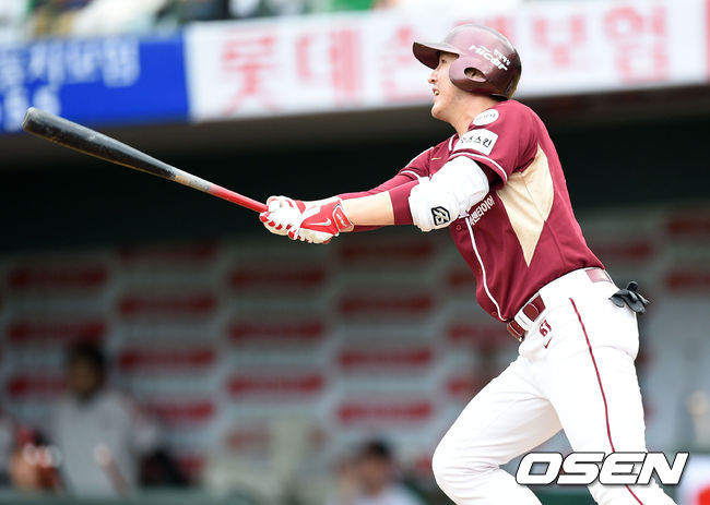 4회초 1사 2,3루에서 넥센 유한준이 희생플라이를 치고 있다.