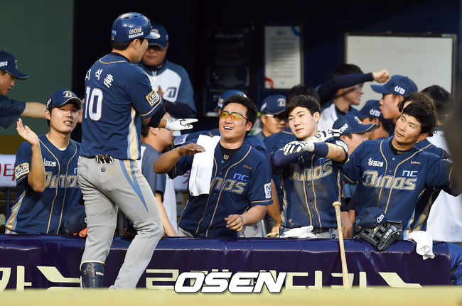27일 오후 서울 잠실구장서 열린 ‘2015 타이어뱅크 KBO리그’ LG 트윈스와 NC 다이노스의 경기, 7회초 1사 만루 NC 지석훈이 역전 희생플라이 날린뒤 동료들의 축하를 받고 있다.