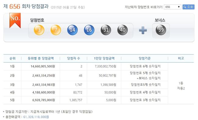 [OSEN=이슈팀] 로또 제 656회 당첨번호가 3, 7, 14, 16, 31, 40번으로 가려졌다. 2등 당첨을 판가름하는 보너스 숫자는 39번.