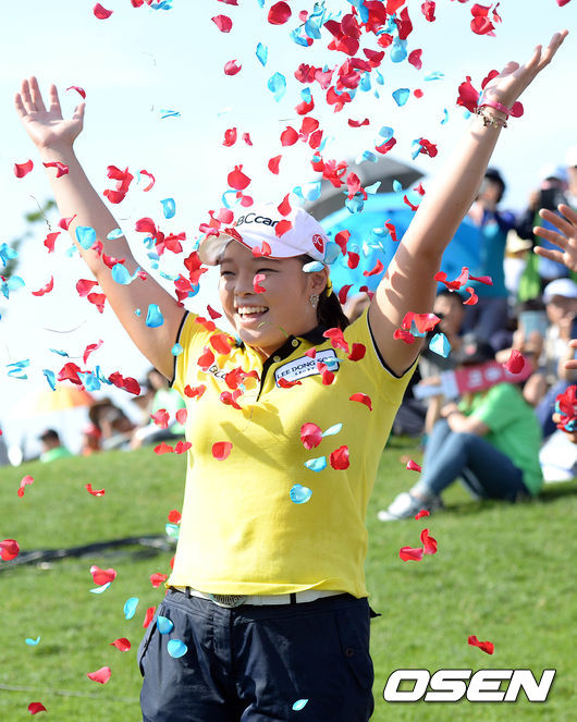 우승을 차지한 장하나가 꽃가루 세리머니하고 있다.