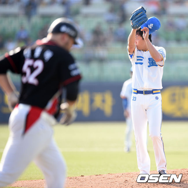 1회초 2사 2루에서 삼성 차우찬이 kt 댄블랙에게 볼넷을 허용하고 있다.