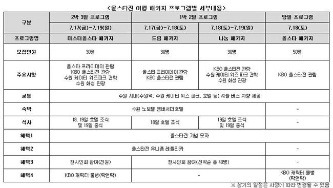 이번 올스타전 여행 상품은 올스타전 당일(18일)에만 참여가 가능한 올스타 패키지, 올스타 프라이데이(17일)와 올스타전 모두 참여할 수 있는 1박 2일 프로그램 드림 패키지(17~18일)와 나눔 패키지(18~19일), 그리고 올스타 프라이데이 및 올스타전 관람은 물론 수원 화성 관광까지 2박 3일 프로그램으로 구성된 미스터 올스타 패키지(17~19일) 등 올스타전을 만끽할 수 있는 총 네 가지 패키지로 구성되었다.