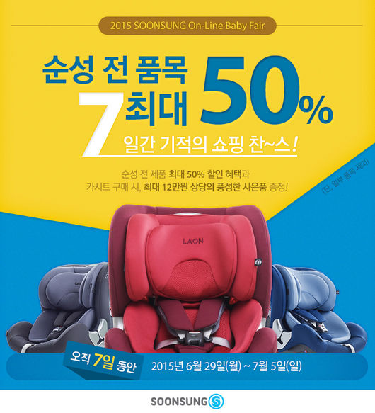 유아용 카시트 전문기업 ㈜순성산업(대표 이덕삼, www.soonsung.com)이 오는 7월 5일까지 일주일간 온라인 베이비페어를 열고 순성 카시트를 비롯한 전 제품 최대 50% 파격 할인 행사를 진행한다고 29일 밝혔다.