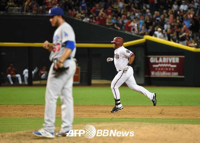애리조나 다이아몬드백스 야스마니 토마스가 30일 LA 다저스와 홈경기 6회 2점 홈런을 날린 후 베이스를 돌고 있다. 다저스는 팬 인터피어런스라고 어필했으나 받아들져지지 않았다. ⓒAFPBBNews = News1(무단전재 및 재배포 금지)