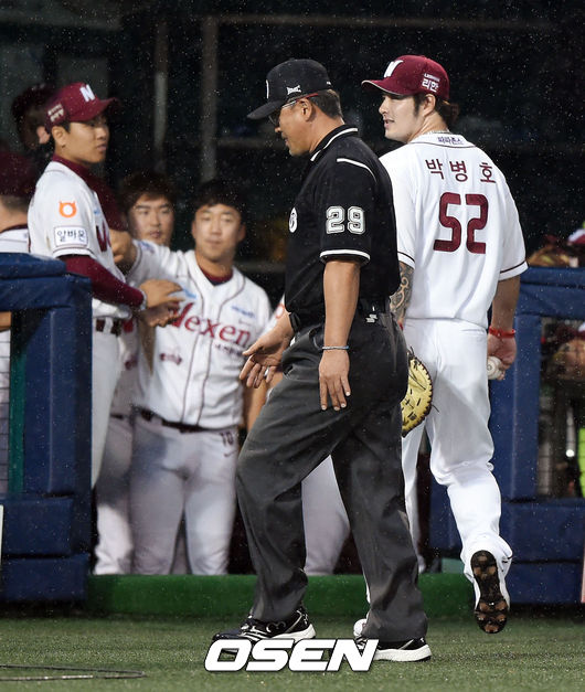 30일 오후 서울 목동구장서 열린 ‘2015 타이어뱅크 KBO리그’ 넥센 히어로즈와 삼성 라이온즈의 경기, 1회말 시작과 함께 내리는 비에 경기가 중단되자 박병호가 더그아웃으로 들어가고 있다.