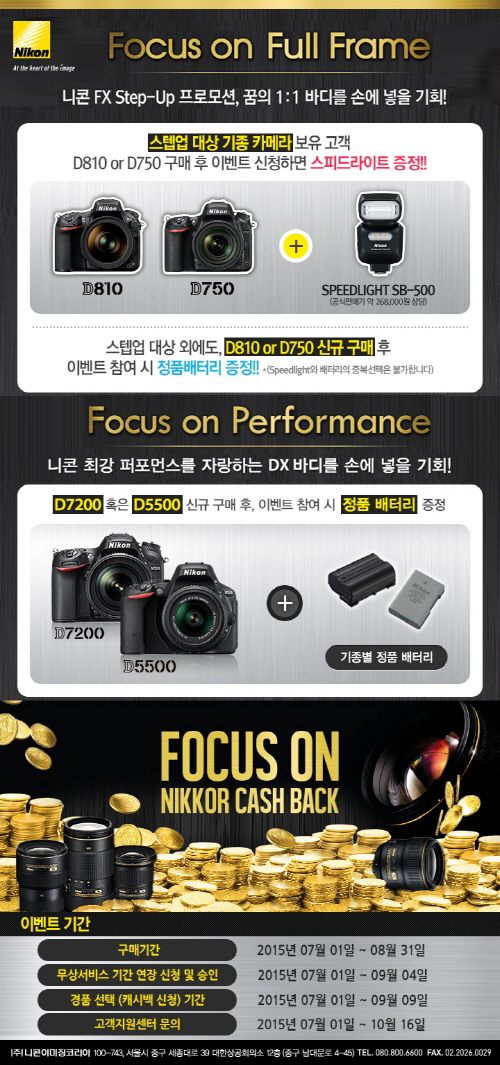 사진 생활을 한 단계 상승 시켜줄 스텝업 프로젝트는 FX 포맷 DSLR 카메라인 D810 또는 D750을 구매하고 이벤트에 참여하면 스피드라이트 'SB-500'을 증정한다. 단, 스텝업으로 지정된 DSLR 카메라를 최초로 정품 등록한 회원에 한해서만 가능하다. 스텝업 프로젝트에 지정된 DSLR 카메라는 D70을 비롯해 D800E 등 총 15종이다.