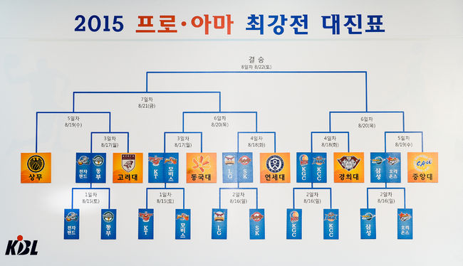 2015 프로-아마 최강전 조추첨이 1일 논현동 KBL 센터에서 열렸다. 이번 대회는 8월 15일부터 22일까지 서울 잠실학생체육관에서 진행되며, 프로 10개 팀과 대학 5개 팀, 상무까지 16개 팀이 참석한다.