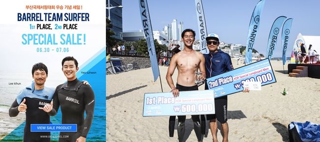 워터액션 스포츠웨어 대표 브랜드 배럴(www.getbarrel.com)은 지난 주말 열린 '2015 부산시장배 국제서핑대회'에서 배럴팀 소속 서퍼 예수환, 이기훈이 우승과 준우승을 거둔 것을 기념해 오는 6일까지 온, 오프라인 할인 행사를 진행한다.