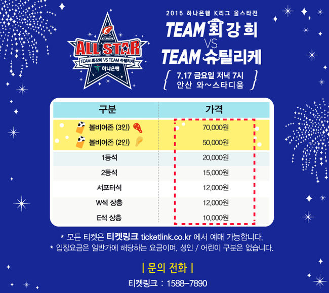한국프로축구연맹(총재 권오갑)은 오는 7월 17일 저녁 7시 안산 와스타디움에서 개최되는 ‘2015 하나은행 K리그 올스타전 팀 최강희 vs 팀 슈틸리케’ 의 2차 티켓 판매를 시작한다.